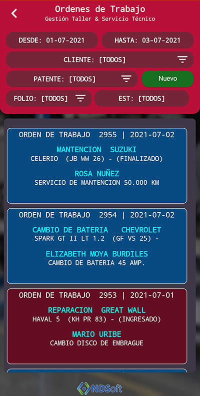 La pantalla de Ordenes de Trabajo, le permitirá crear sus ordenes, buscar en el historial, cambiar su estado y llamar al cliente directamente desde la app.