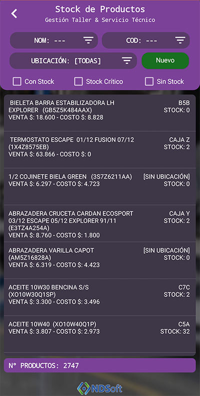 Gestión Taller le permite mantener el inventario siempre bajo control: visualice stock crítico, administre precios y márgenes de ganancia, y genere etiquetas de códigos de barra para una rápida identificación de repuestos.