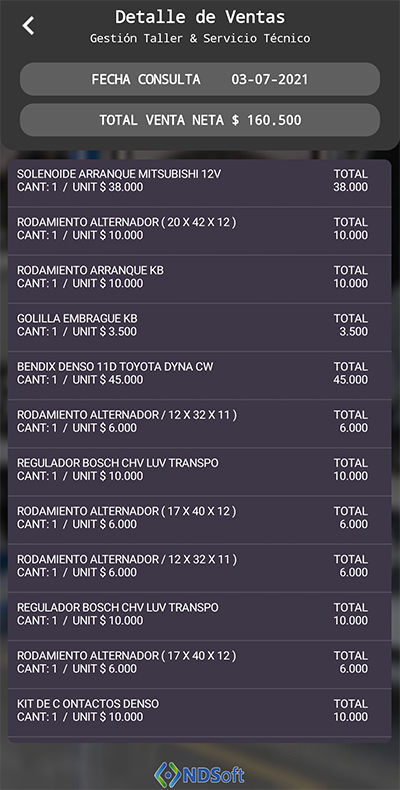 La app cuenta con una pantalla para revisar todas las ventas de productos realizadas directamente desde el punto de venta del software.